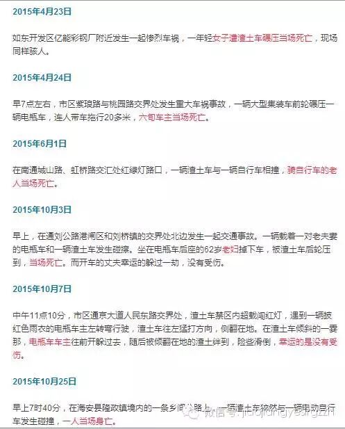 上图是记者提供的近年来南通渣土车肇事案件。我认为,媒体监督交警是应该的,但不能自说自话,一定要实事求是;出现错误也要虚心改正,诚恳道歉,而不是终强词夺理,死不认帐。同样,交警在渣土车管理方面,必须彻底查清有无与承包商利益瓜葛,对渣土车有无放纵的主观愿望和客观实际。人命关天,你如果为了俩钱儿就昧了良知甚至纵容违法犯罪,这是没有人性的,天理难容的!