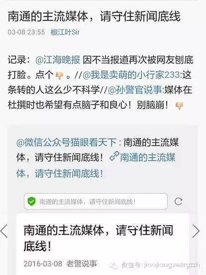 6、媒体可以监督交警,放大了说就是媒体可以监督政府公务以及政府公务人员,我们也一样可以监督媒体,@江海晚报 发布虚假新闻,我去年就关注并批评过,建议搜叶色微博关键词“江海晚报”,@江海晚报 出来走几步?你还欠读者一个道歉!我不会忘记,还有一个造过谣被打过脸的微信公号叫【城市日历】是南通广播电视台的。