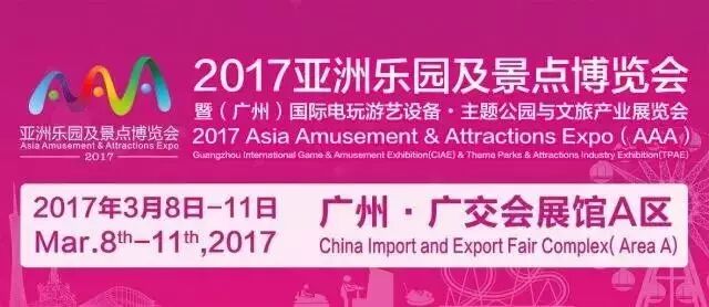 2017亚洲乐园及景点游博会(AAA)将于2017年3月8-11日在广州广交会展馆(亚洲第一大馆)迎来新一届盛会,届时,全球电玩、游艺、主题公园、水上乐园、休闲旅游等相关领域的最新产品将一一亮相。