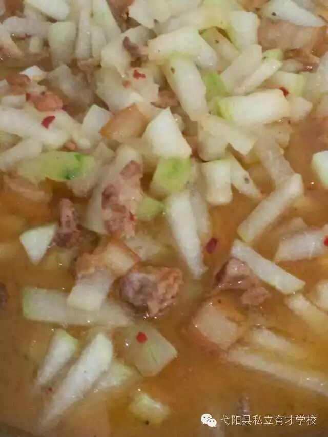 冬瓜味甘、淡,入肺、大肠、小肠、膀胱经;具有润肺生津,化痰止渴,利尿消肿,清热祛暑,解毒排脓,猪肉来自学校的养猪场,肉鲜味美