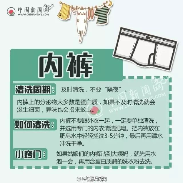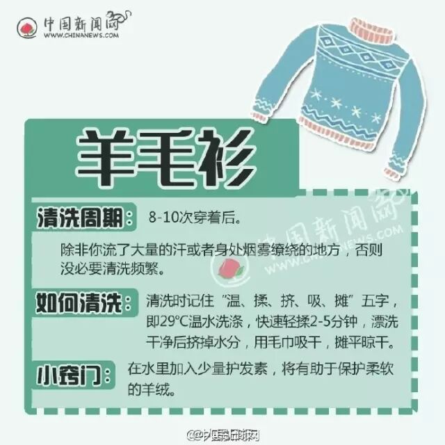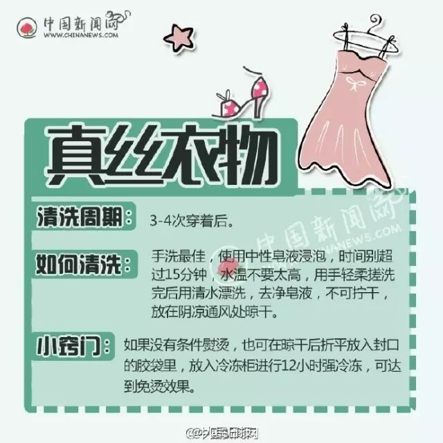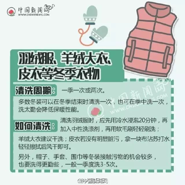 有人说,衣服没有穿坏的,都是被洗坏的。确实,衣物都有个最佳清洁周期,洗得过频会加快衣物的磨损,清洗不及时又会引起细菌滋生,带来健康风险。不同种类衣服要用什么频率清洗才好?看下图↓↓↓正确洗衣姿势,赶紧get√