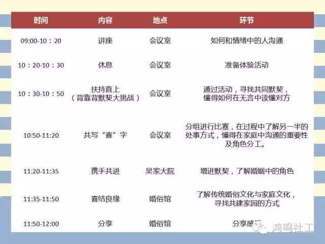 婚姻是一条河,由两条相爱的小河汇流而成,而这条河注定有险滩和暗礁,不排除有一条小河自己改变流向,两条小河交汇成大河,要懂得沟通的艺术,才能让爱之河流动起来,走的更远更长。    9月27日,九江吴家大院将举行一场新婚夫妻成长活动,希望能通过讲座、游戏和婚俗体验等形式,让大家能从中体验生活中了解夫妻间沟通的重要性,寻找适合两人间合适的沟通方式,在品味平淡寻找不同的乐趣,让爱情保鲜。    幸福须主动,实现理想的婚姻,可不是那么简单的噢!珍惜机会,快快点击原文,填写报名表参加活动!    从今年6月初至今,九江镇婚姻登记处辅导室接触的婚姻辅导个案有52例,其中离婚案例29例,占56%,在这29例中,因性格不合、无法沟通原因离婚的有14例,可见沟通在婚姻家庭中的重要性。    著名讲师林泽起先生用生动的语言,出色的演讲技巧,传授夫妻积极沟通的秘诀,帮助新婚夫妇安稳渡过磨合期!    这里嘛,先卖个关子。想考验或者提升夫妻默契?想多些亲密互动?想知道对方到底想啥?这个模块,就是属于你们的!    “一拜天地,二拜高堂,夫妻对拜……”TVB剧看得多,你萌可知道背后的寓意么?    南海区妇联“家庭服务品质提升年”项目之儒乡“幸福家”形成期家庭教育项目在九江建立南海首个婚俗文化馆——九江融爱婚俗文化馆,我们的新人怎么可能错过!既能深度体验九江传统文化,还能重现岭南地区的婚礼习俗,婚俗馆绝对是小两口休闲娱乐涨知识的好去处。                 上午8:30-12:00,下午14:30-17:00