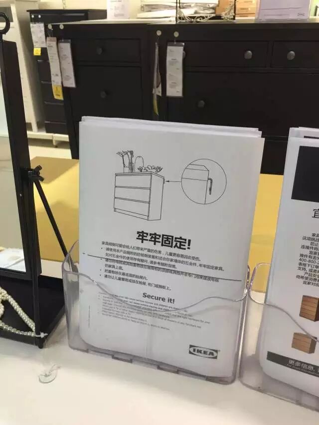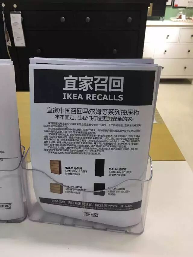 鉴于民众谴责的声音太强烈,宜家召回该系列产品,可是,召回范围却没!有!中!国!,宜家(中国)投资有限公司终于决定在中国市场上召回1999年至2016年期间销售的马尔姆等系列抽屉柜,据统计共1660845件。 热情如火的记者马上赶到广州宜家门店探(ba)访(gua),发现召回通知已经贴出,消费者可以办理退货并可全额退款。 除了“马尔姆大魔王”,一些有潜在隐患的柜子也在召回之列。包括百灵三斗抽屉柜、布松纳两斗抽屉柜等等。 其实,什么系列不要紧,要紧的是,大家记得有些柜子是必须得固定的。 热情如火的记者友情提醒,广州宜家的公告说,商场会给大家免费提供上墙连接件,还会提供免费上门安装的服务哟。 然后,你可以亲自把柜子护送到广州宜家商场,现场退货。 或者,拨打服务电话申请上门退货,服务电话是400-800-2345。