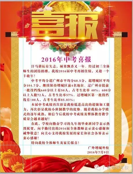中考平均分超广州市平均分60.5分,超增城区平均分104.7分,继续保持增城区前4名地位。