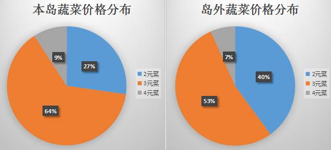 本岛蔬菜:3种蔬菜品种在2-3元/斤,7种蔬菜品种在3-4元/斤,1种蔬菜品种在4-5元/斤,0种蔬菜品种在5-6元/斤,0种蔬菜品种在6-7元/斤,菜价主要集中在3-4元/斤间。