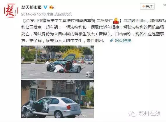 21岁荆州籍留美学生驾法拉利遭遇车祸