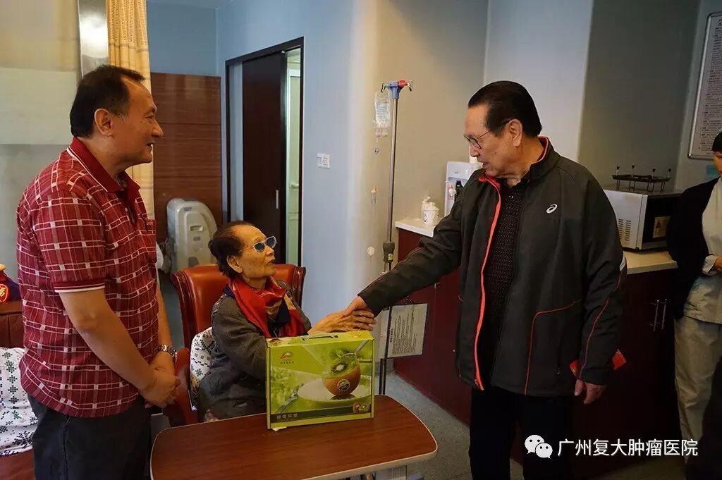 ↑ 在五病区的普通病房,有一位90岁的广州老奶奶,患有口腔癌,春节没有回家过节,除夕夜就在医院度过。年初一一早,老奶奶及她的家人没有想到徐院长会来看望他们。老奶奶的老伴执意走出病房外面要与徐院长合影。他自我介绍说,他是1947年参加革命的老干部,在广东省外经贸委工作。他伸出大拇指,称赞复大治疗服务好!
