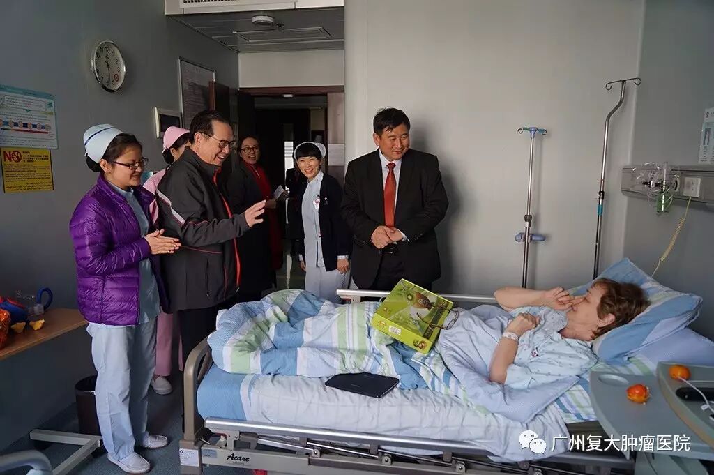 ↑ 医院VIP病房有一位来自泰国的85岁老人,老人患有肾癌,肿瘤达7cm。她咨询过当地医生,都劝她放弃治疗。后来她来到广州,1月23日,在广州复大肿瘤医院做了微创消融手术。在医院康复期间,正逢中国的农历新年,多位儿女陪她在中国过春节。她的六个儿女中,有国会议员,有当地医院的院长……