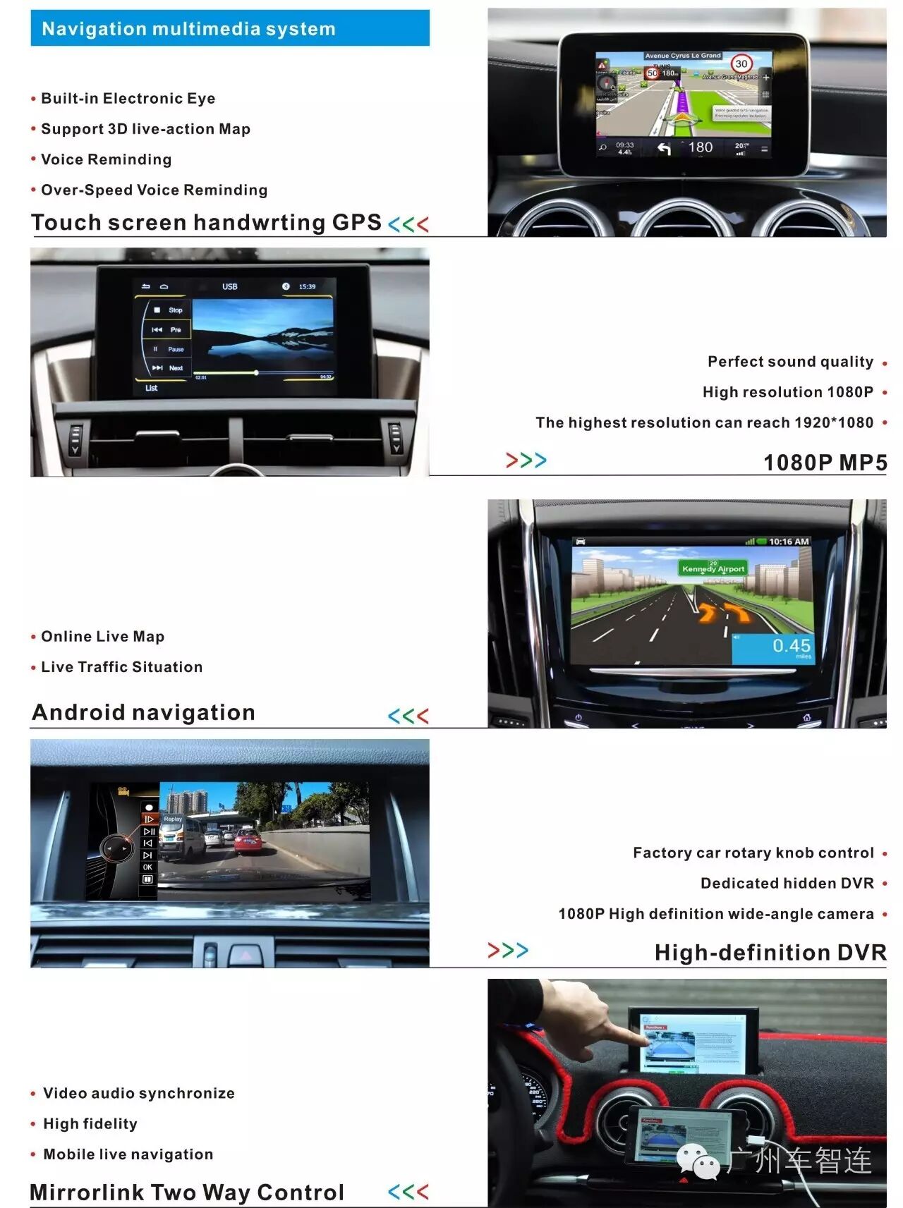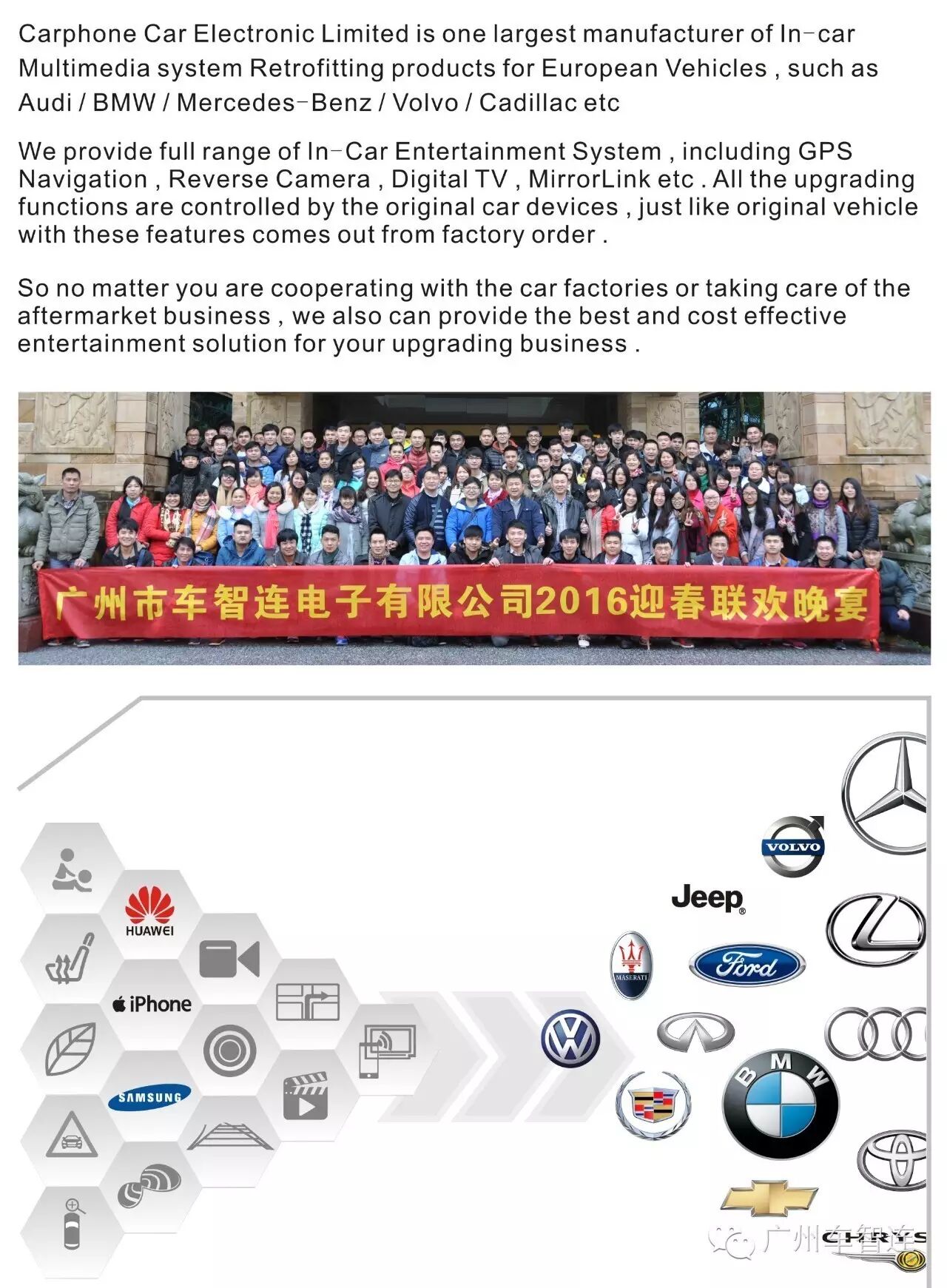 尊敬的汽车用品行业领导 同仁:广州市车智连参加2016年德国法兰克福展,展示最具差异化的豪车安卓系统、换屏、原车屏升级多媒体影音系统。升级功能:电致变色自动防眩目后视镜、安卓导航、原车旋钮控制360°全景倒车系统、手机互联、原车大旋钮控制专用数字行车记录仪、专用隐藏式wifi记录仪、精准倒车轨迹、超级MP5、GPS导航、大旋钮控制座椅加热、座椅通风、座椅按摩、原厂款等空气净化、原厂款香氛系统等功能。另有定制精品磁吸手机支架、磁吸防摔手机壳诚意邀请您于展会期间莅临我司展位参观指导,共商发展大计。