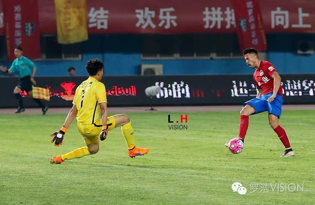 5月28日晚19:35,2016中超联赛第11轮,河南建业坐镇主场郑州航海路体育场迎战广州富力。哈维尔头球破门攻入制胜球,吴龑发挥神勇多次扑出必进球,最终建业队1-0战胜富力。摄影:罗浩