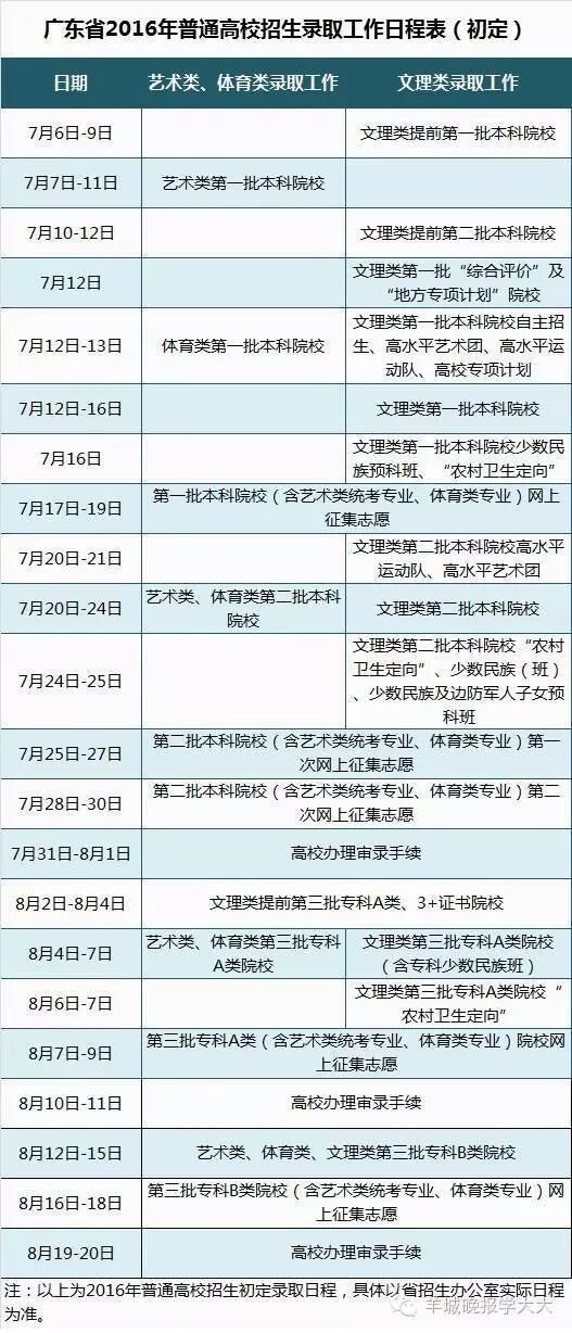 省教育考试院最新公布了《广东省2016年普通高校招生录取工作日程表(初定)》,介绍了各批次录取工作的日程安排。
