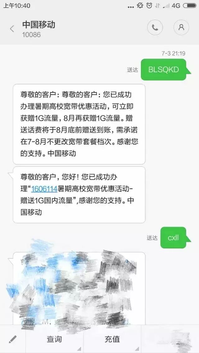 等待两三分钟便会收到回复!也可发送cxll进行流量查询进行确认喔!