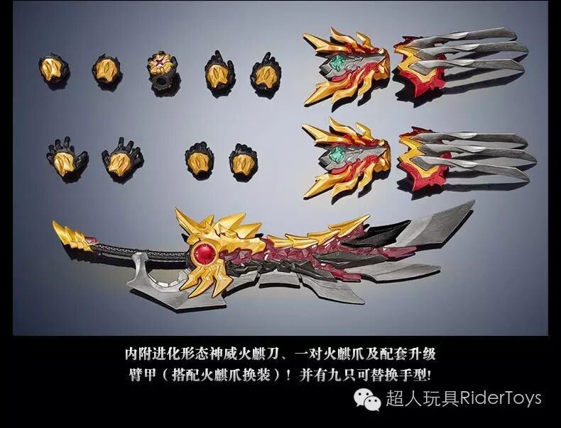 商品内容 | l 本体 l 展示用辅助支架一套 l 交换用左手型4种 l 交换用右手型4种 l 捕王印专用手型 l 火麟爪 l 神威火麟刀 |