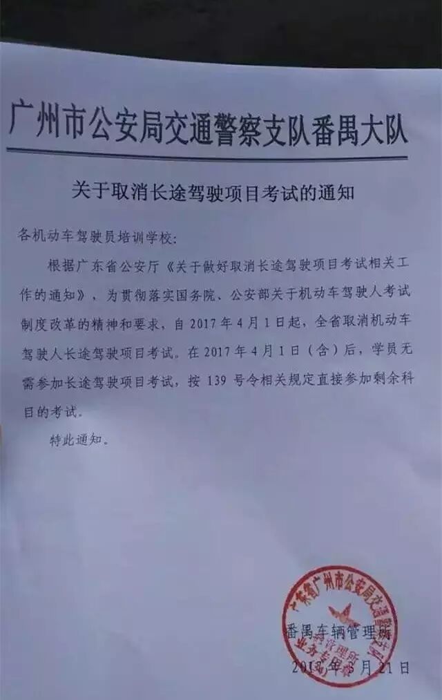 2017年4月1日起,广东省机动车驾驶人长途考试项目正式取消。