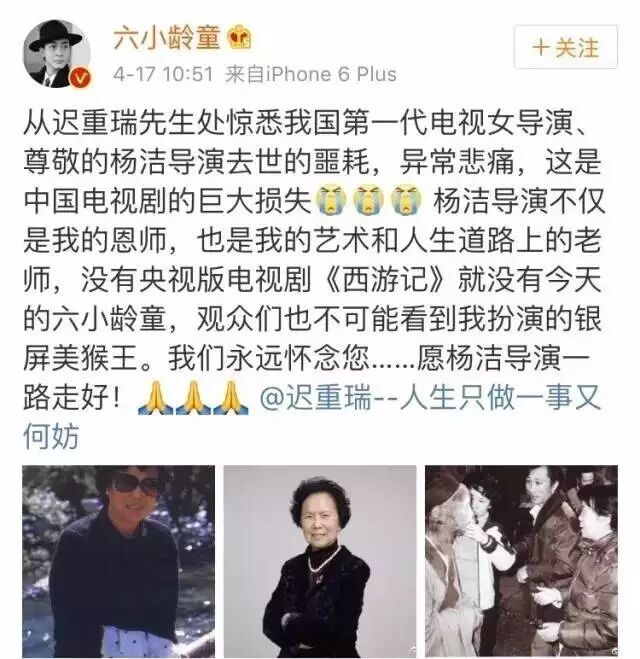六小龄童发文悼念:、尊敬的杨洁导演去世的噩耗,异常悲痛。”杨洁是新时期全国影视十佳导演,曾获首届中国电视剧导演工作委员会“杰出贡献奖”。