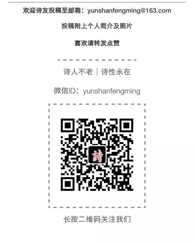 1/3为作者稿费,1/3为公众号编辑酬劳,1/3为平台公益开支。如有疑问,可联系公众号管理员冯媛云(微信号:fyysummer)或赖宁艺(微信号:ningyi0907),欢迎各位诗友投稿,愿云山凤鸣诗歌公众号为您所爱!
