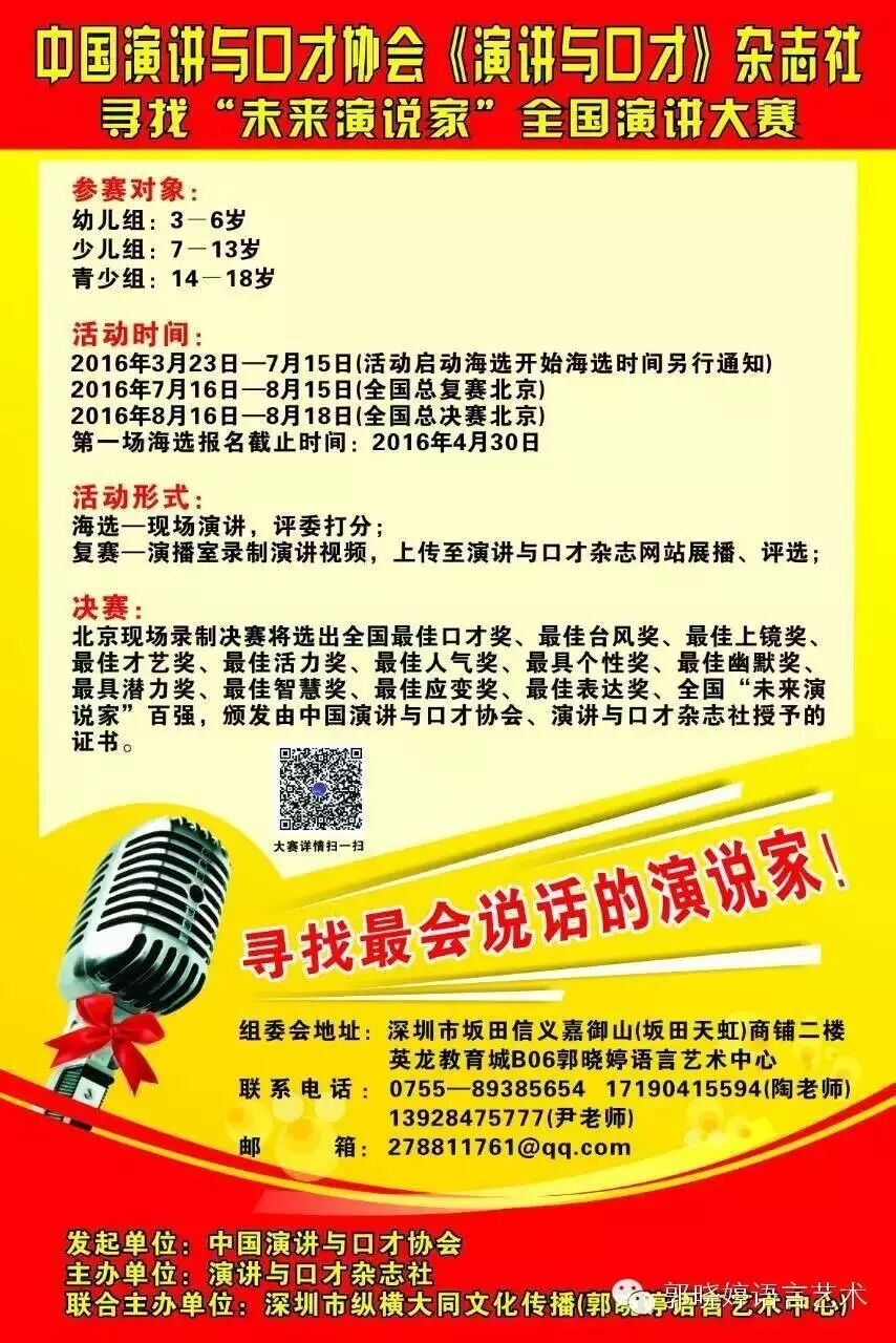 口才领域最具影响力的全国畅销杂志《演讲与口才》杂志社联合郭晓婷语言艺术中心举行广州深圳赛区寻找“未来演说家”全国演讲大赛即将开幕。