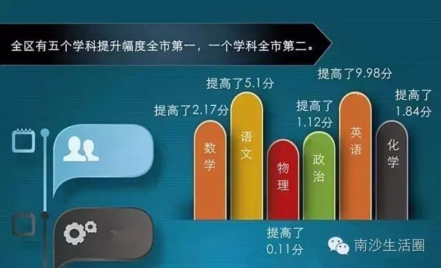 学科平均分提升幅度全市第一。今年南沙区有五个学科提升幅度全市第一,一个学科全市第二,其中,英语平均分提高了9.98分,语文平均分提高了5.1分,数学平均分提高了2.17分,化学平均分提高了1.84分,.12分,物理平均分提高了0.11分。