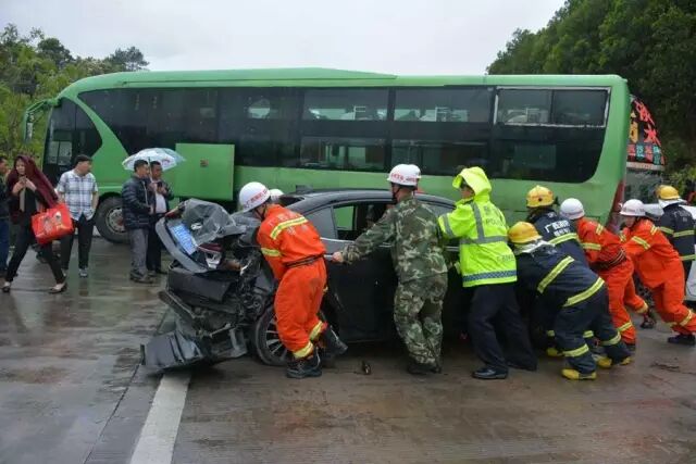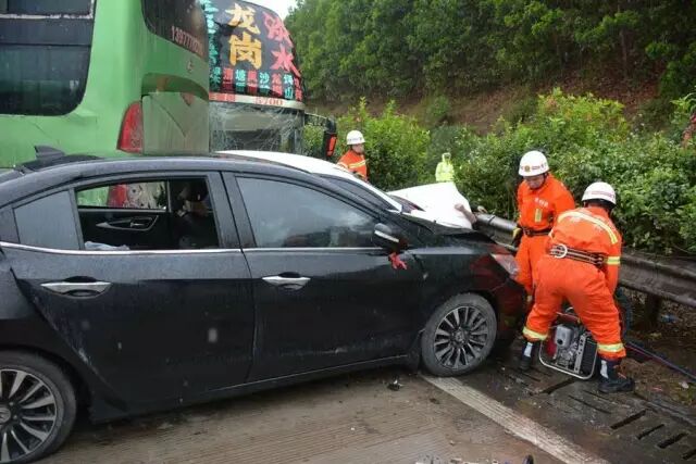 12时50分,岑溪中队到达现场。经侦查发现,车牌号为桂K17936的大巴车与粤SA066X的小轿车发生二次追尾事故,一人被夹在车辆与护栏之间,消防官兵立即利用切割机破拆隔离带护栏救人。