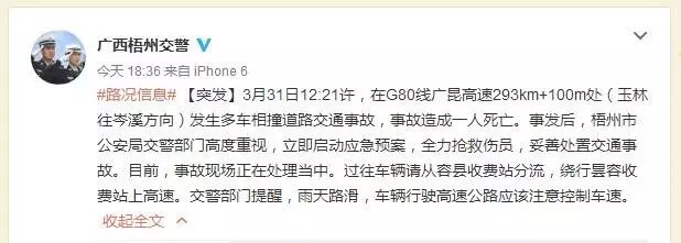 梧州交警18点36分通过微博通报称,3月31日12:21许,在G80线广昆高速293km+100m处(玉林往岑溪方向)发生多车相撞道路交通事故,事故造成一人死亡。事发后,,立即启动应急预案,全力抢救伤员,妥善处置交通事故。目前,事故现场正在处理当中。过往车辆请从容县收费站分流,绕行昙容收费站上高速。交警部门提醒,雨天路滑,车辆行驶高速公路应该注意控制车速。