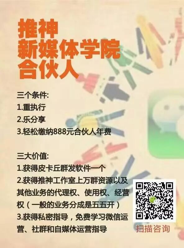 所以今年我做了一个小小的规划,注册推神新媒体商标,成立推神新媒体学院,招募合伙人,系统培训合伙人运用微信创业,系统化,仪式化,课程化,主要培训内容就是快速搞群,快速迭代裂变,快速月入上万,言传身教,分享案例。。。