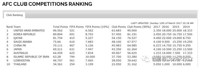 在3月的亚足联协会技术排名中,阿联酋以96.562继续稳居第一名,韩国89.894分排名第二,卡塔尔81.754分排名第三,沙特75.66分排名第四,中国70.111分排名第五,日本以69.211分排名第六。中国继2016年年终技术排名超越澳大利亚后,在3月份技术排名又超越了日本。