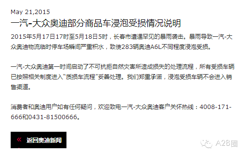 简单回顾一下事件始末。有部分微信公众号在朋友圈中曝光了奥迪临时物流停车场被暴雨侵袭,导致200多台奥迪A6L遭到水淹的消息。此文一出,仿佛一勺大粪被抛进烧的正好的火锅中,恶心至极,要知道,此时正是奥迪300万辆活动的启动前夕,是巧合么?呵呵!