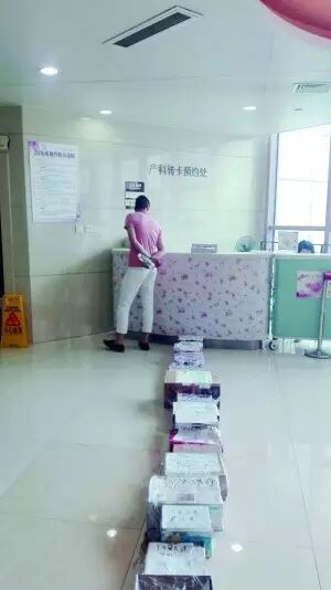 在产科转卡预约处,地上放着一排用胶带连接的纸盒,上面写着姓名、电话、排队日期和编号,有些纸盒上还写着“人在现场请勿动”