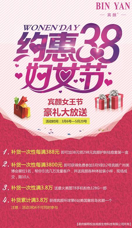 2.补货一次性每满3800,即可获得免费参加3月9到12号宾颜广州美博会展位1名,帮你引流几万流量客户,并送宾颜各种体验装小样,现场成交,限10人