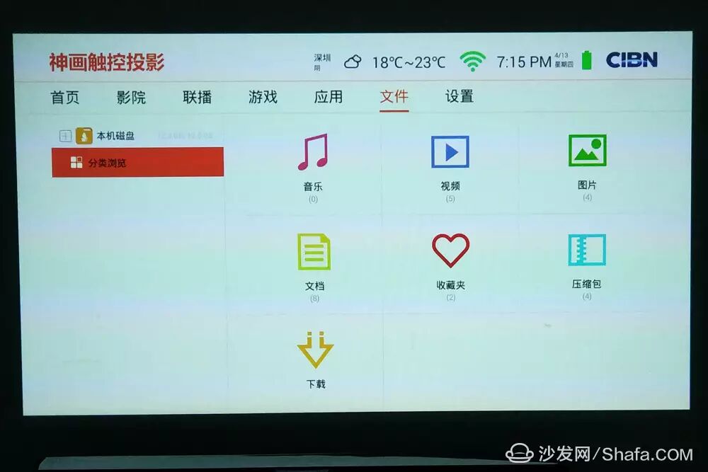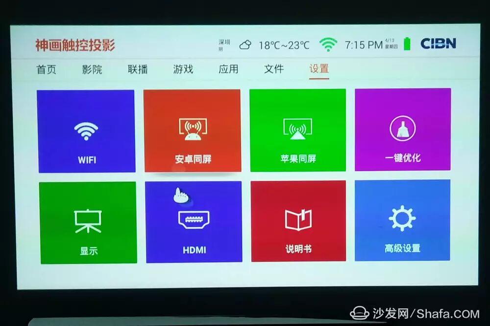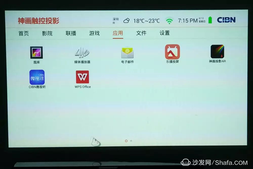 通过主界面能够清晰的看到神画触控投影丰富的内容配置,顶端的状态显示栏,往下则是分类栏:首页、影院、联播、游戏、应用、文件、设置,下方则是卡片式图片展示,鼠标移动至相应图标还会出现触动式动画效果。