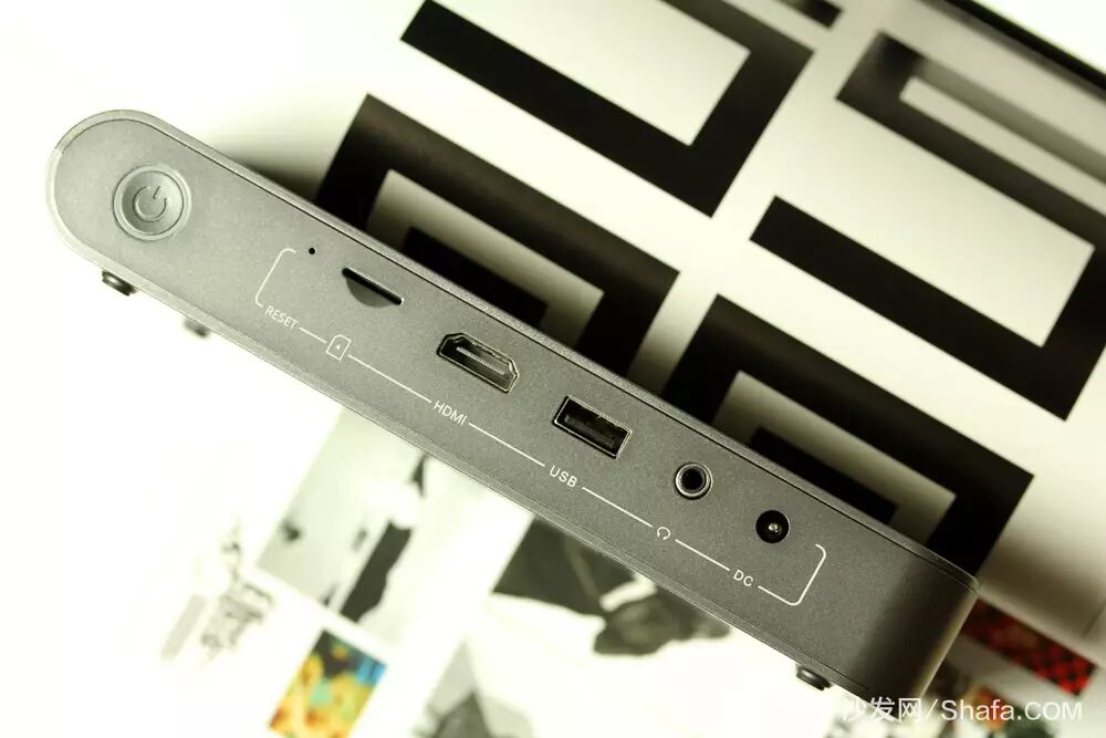 后端是系列接口和按键——电源按键、USB2.0接口、3.5mm耳机接口、HDMI接口、电源接口,满足外接。