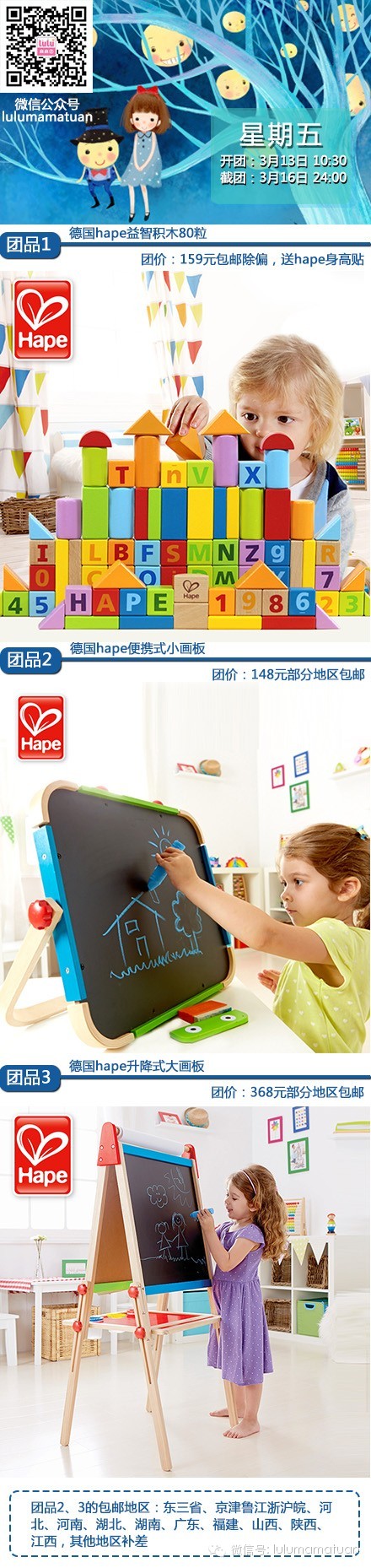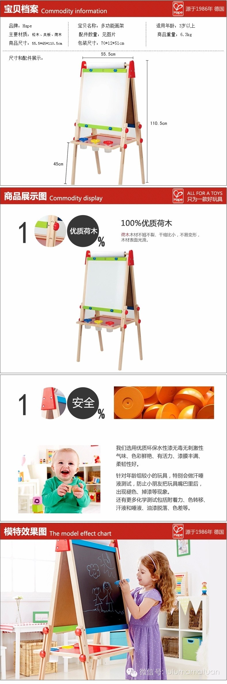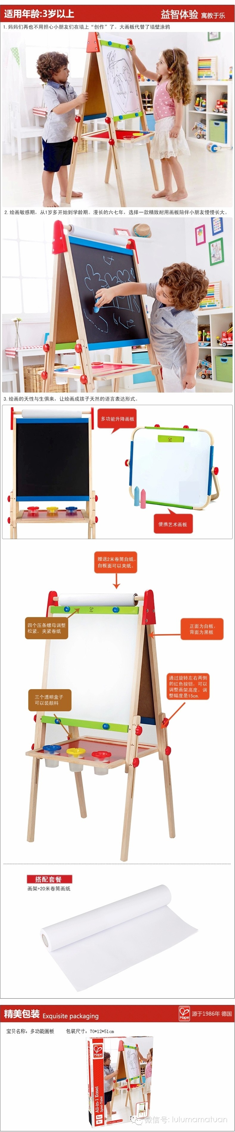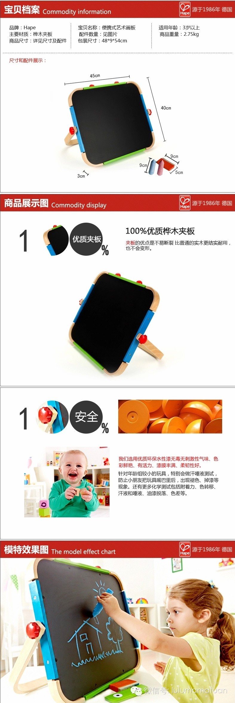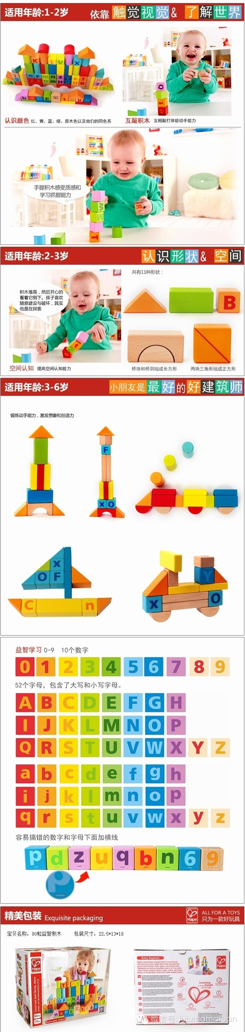 德国hape积木80粒,进口榉木,全部使用食品级水性漆,宝宝把积木放进嘴里也不用担心,且所有积木块都经过防吞测试。这款积木覆盖了字母\数字\形状,可边玩边学~还有hape的两款画板,都是双面的--黑板+白板,便携方便携带,升降的可以用的比较久~都是全网最低价~