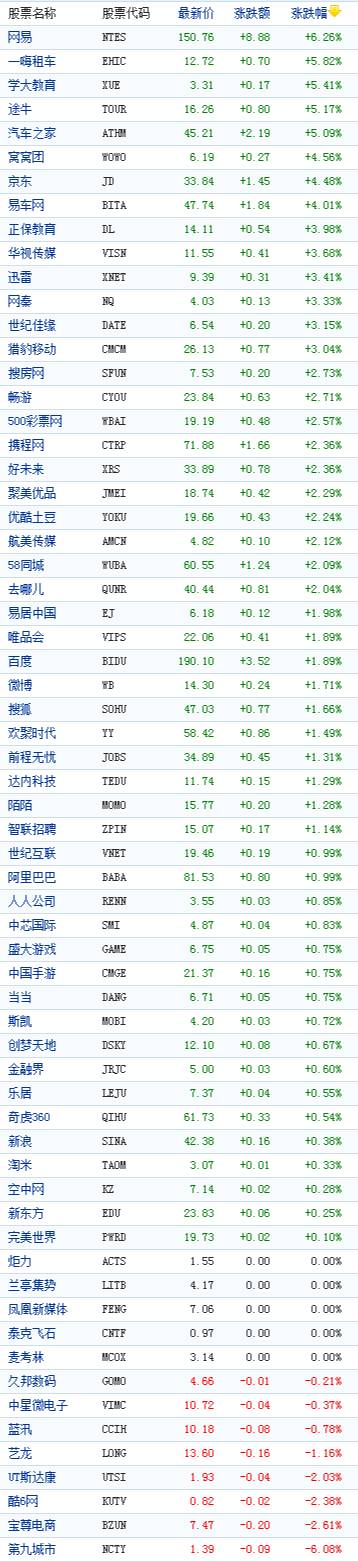 中国概念股周四收盘普涨,5支股票涨幅超过5%,网易涨6.26%报150.76美元,一嗨租车涨5.82%报12.72美元,学大教育涨5.41%报3.31美元,途牛涨5.17%报16.25美元,汽车之家涨5.09%报45.21美元;4支股票跌幅超过2%,.08%报1.39美元,酷6网跌2.38%报0.82美元,宝尊电商跌2.61%报7.47美元。
