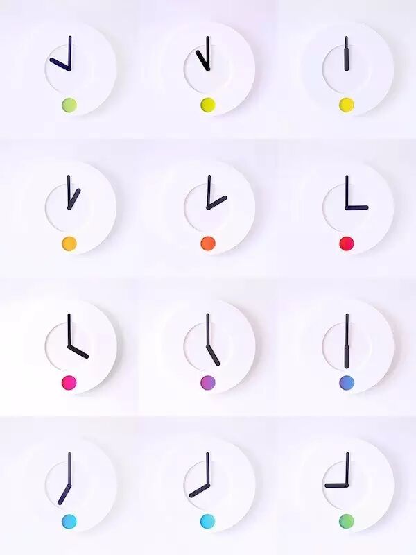 英国产品设计师 Duncan Shotton 为 Rainbow Spectrum 设计了一款渐变色时钟,把时间和颜色联系到一起。在表盘下方有一个渐变色色谱,当表针走动时,圆孔里显示的颜色也会慢慢改变,从而将时间和颜色关联在一起。