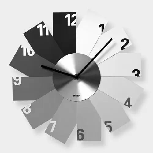 Kazunori Tashima为MoMA设计了一款黑白钟表,表盘外围由12个扇叶组成,每个扇叶代表一个时间点,从1点到12点,扇叶的颜色由纯白逐渐变暗,最后变成纯黑色,仿佛正在诉说时间的故事:时间可以冲淡一切,周而复始,如此往复。