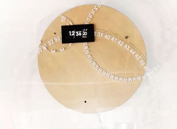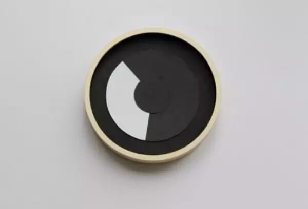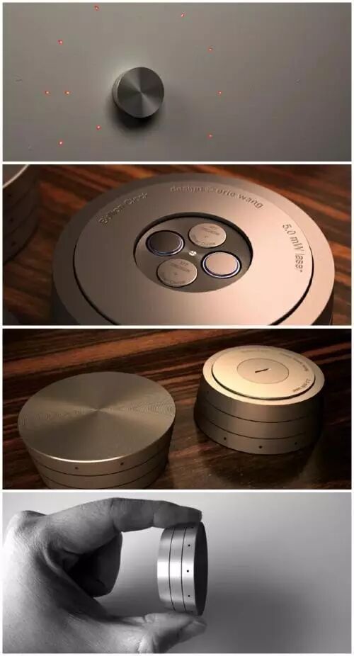Eric Wang设计了一款“金饼钟表”,乍一看你很难看出这是一款钟表,除非你动动手与其互动。这款金饼钟表由三个叠加在一起的不锈钢铁饼做成,最顶部的铁饼是静止的,通过倾斜的微孔用激光在墙壁上投影出表盘,中间和底部的铁饼是转动的,分别用激光投影出时针和分针。