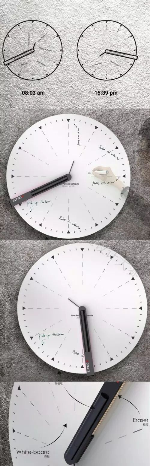 工作任务往往是限定时间的,和时间绑定在一起。来自浙江大学的郦轲、庞晟立、陈怡伶据此设计了一款日程钟表,表盘是一块用来写字的白板,指针下方是一个板擦,指针上面有一只可以取下来的白板笔。