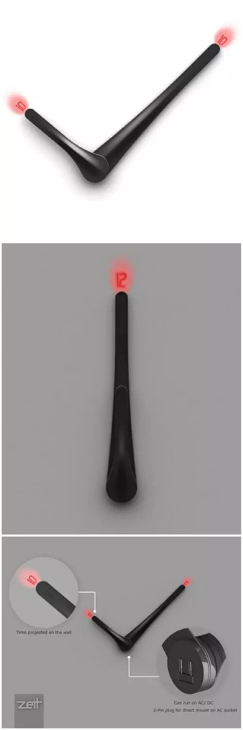 正所谓鱼和熊掌不可兼得:指针时钟简单直观,一目了然;数字模拟时钟精确,不受物理空间限制,可哪个是鱼,哪个是熊掌呢?或许该换个角度:鱼我所欲,熊掌亦我所欲也。Uttam Banerjee设计的这款zeit(德语里的“时间”)钟表将指针时钟和数字时钟合二为一,背面是一个标准插头,可以插在普通插座上,正面是两个表针,表针末端装有LED灯,能在墙上投影出当前的时间,当两个指针重合时只显示分针的时间。