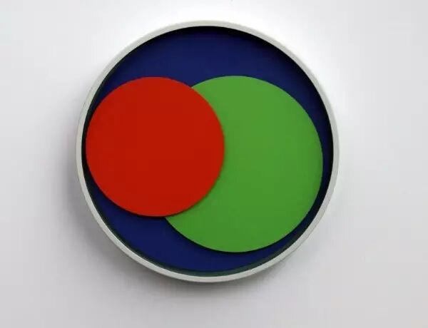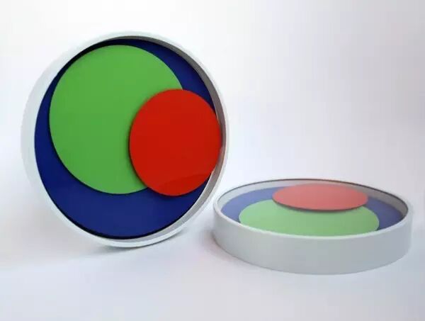 这款叫做「轨道(Orbit )」的时钟是由三块纯色的色盘组成,表盘底色是深蓝,无指针、无刻度,表现时间点的方式是另外两个大小不同的圆形色盘组成,一红一绿,交错相叠,红色盘代表时针,绿色盘代表分针,至于看时间的准确度嘛,随意感受一下就好,不用那么精确。