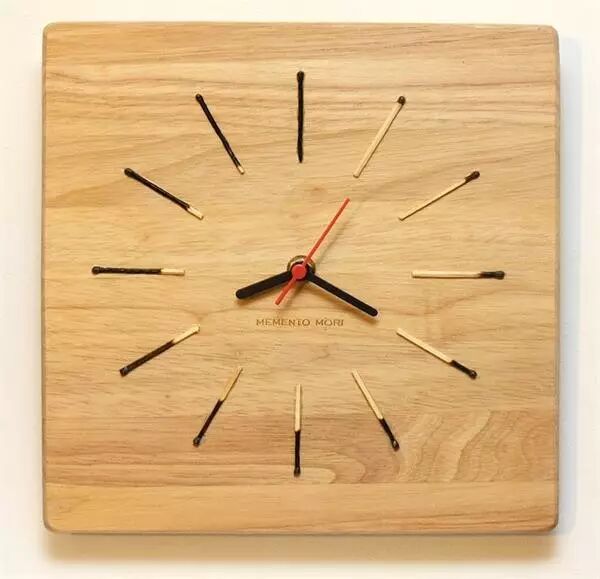 不过最特别的还在于它的数字和表针部分。设计师将燃尽的火柴作为这款钟表的数字部分,12 根火柴棍代表着 12 个数字,将其嵌入挖好的槽内。其中有的是只燃烧了火柴头部分,而剩下的燃烧部分从一点到一半再到一大半最后是整根燃烧,只剩下燃尽后黑色的体态部分。