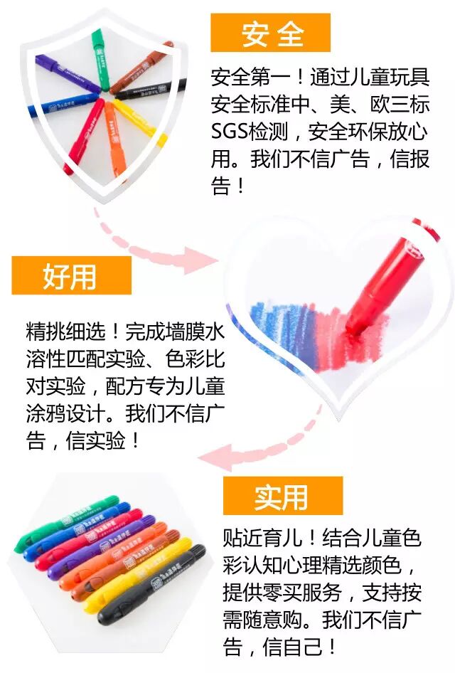 配套的涂鸦笔色彩纯正,颜色艳丽,非常适合涂鸦期的孩子,产品经过中美双标SGS检测。还有全套小画衣、擦拭布,满足涂鸦前后家长需要考虑的各种问题。