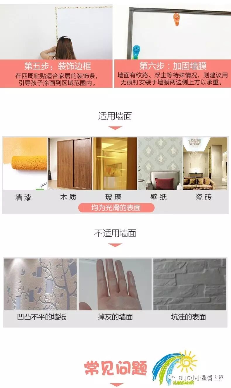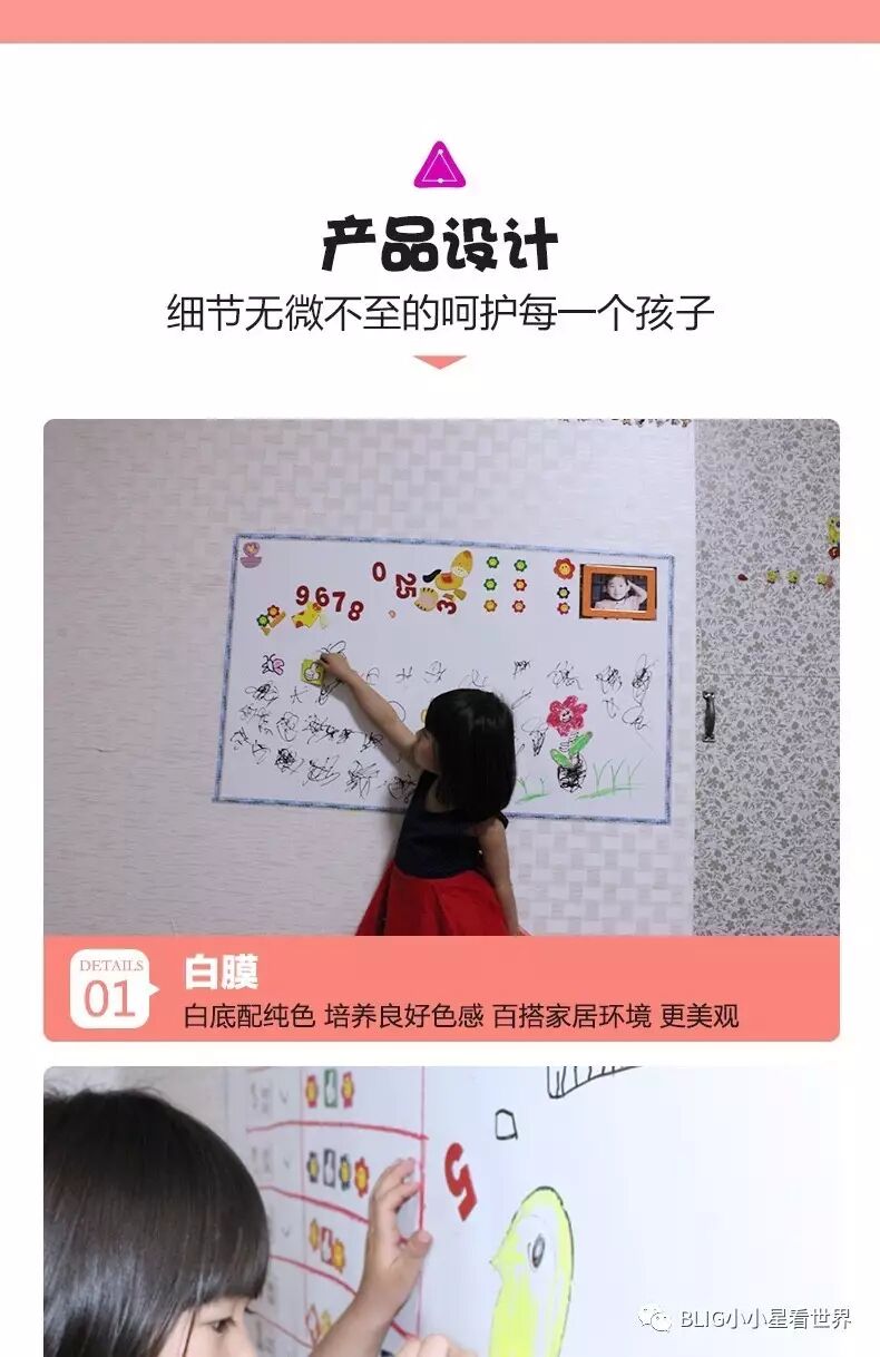 “试试墙膜?现在很多家庭都买给宝宝用,好清洗,还带磁性,可以用磁片拼图背单词。“
