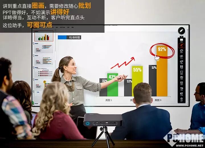 虽然早年神画在投影机行业比较低调,但是很早就进行前沿布局,在技术研发上相当舍得投入。在人机交互提出尚早的年代,神画便开创性的将隔空触控应用于投影行业,并获得全球专利,直接将投影操控体验从1.0时代拉升到2.0时代。从而借助隔空触控的技术特点,独创了商务助手功能,使用者在现场宣讲时可以在投影幕布上直接批注,互动性更强、讲解更生动,现场演示效果事半功倍,所有批注内容更可随时截屏保存,已完全具备电子白板的功能。