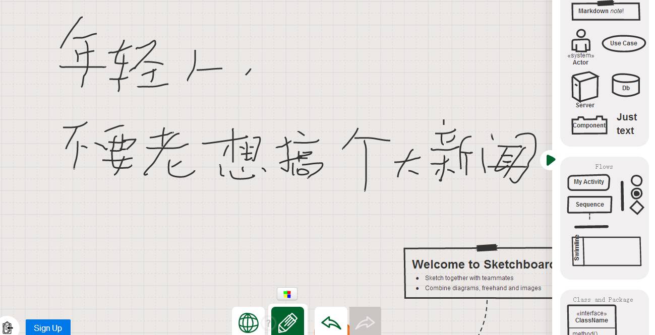 你见过随身携带的白板吗?你想要一个不仅能够随身携带,而且还能无限大小的白板吗?现在就送一个到你的电脑里!这个名为Sketchboard的网站,无需任何登录步骤,只要点开就能获得一块无限大的在线白板。无论是发散灵感乱涂乱画,还是中规中矩做逻辑图,Sketchboard都会为你提供便利。屏幕右方罗列了许多可供使用的图形元素,同时还支持邀请团队多人在线共同使用一块白板。再也不用写了擦,擦了写,就算你开会开到地老天荒,Sketchboard白板军也没在怕的!