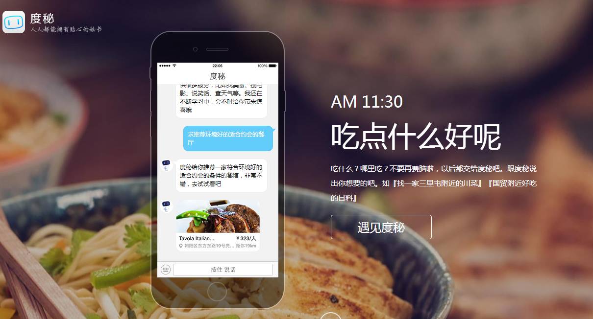 度秘是百度在2015年世界大会上全新推出的功能,旨在为用户体用秘书化服务的语音机器人助手。依托于百度的搜索引擎大背景,度秘能够给人的指导几乎涵盖了生活的各个方面。无论是天气查询,还是就餐场所,无论是电影影评还是各种O2O生活服务,你都可以直接说给度秘听,它会立即跳转到度娘搜索结果几天,为你提供筛选结果供你选择。相比于苹果的Siri语音助手,度秘希望能够具有工具之外的更多功能。不知道iOS用户们,会用进击的度娘代替Siri吗?