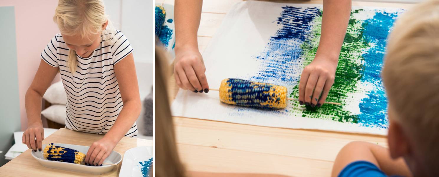 玉米棒沾染颜料,尝试滚动周身,留下出其不意的图案。