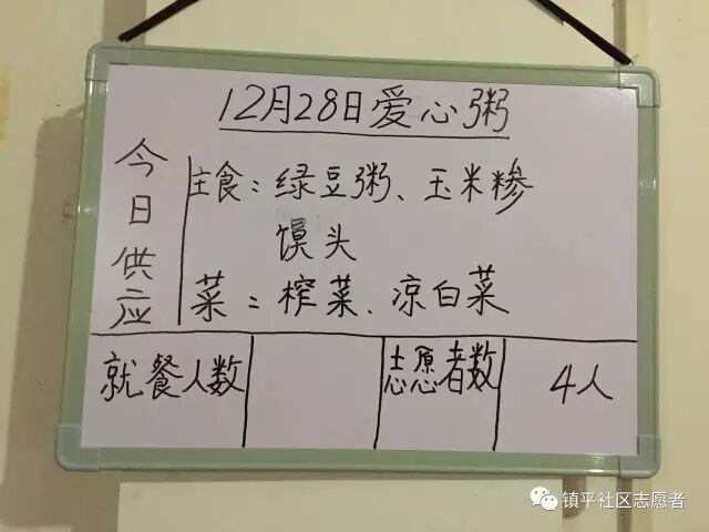 试营业的当天早上,小编 跑步1.4公里到“爱心粥铺”门口,只见熬好的小米粥一大锅另有几电饭锅,蒸馍几袋子,小菜整齐的放着,这个时候不到六点半,冬 天的早晨 ,天还没有放亮,连拍照片还需要闪光灯,志愿者们等待着环卫工人的到来。闲暇之间,小编为“爱心粥铺”的白板写上“12月28日爱心粥,今日供应主食:小米粥、玉米碜、馒头、榨菜、生白菜。参加志愿者4人,用餐者X人。"因为还没有人来吃饭的。