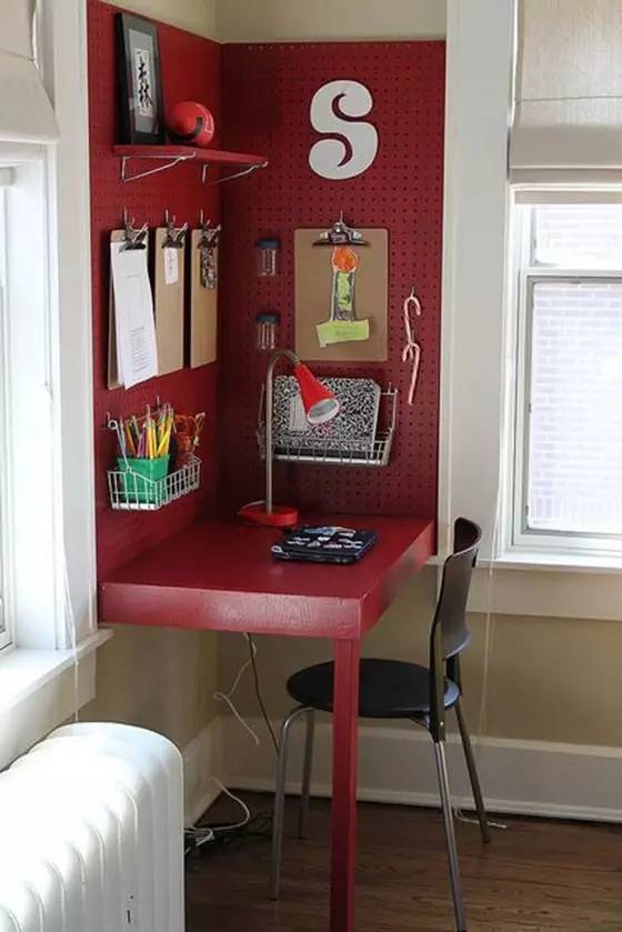 在洞洞板上摆上搁板,小收纳筒、收纳盒尽收其间。这要找个平面摆这些东西,得多少地方啊?现在,小小的学习角打造好了,想不爱上学习都难。