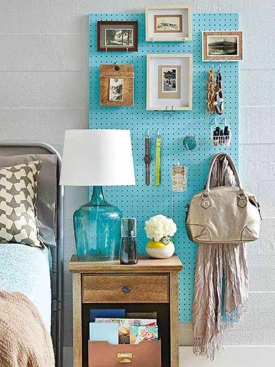 相片墙或者画作不挂起来展示那就是暴殄天物。可是真不忍心在墙上打那么多洞洞。一块洞洞板上墙就OK了。不但能挂相框,还能挂其他杂物。摆一块这样的板子在床头,床头柜再也不会乱了。