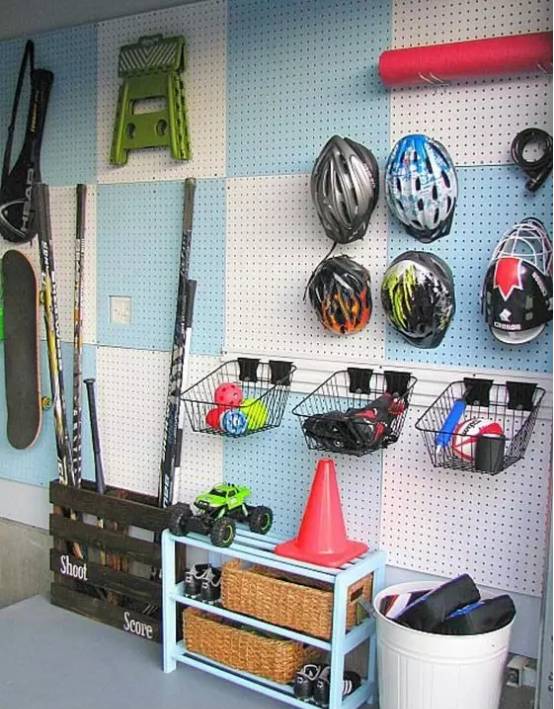 收纳的原则是分门别类。一块洞洞板便把主人的体育用品全部容纳进来。